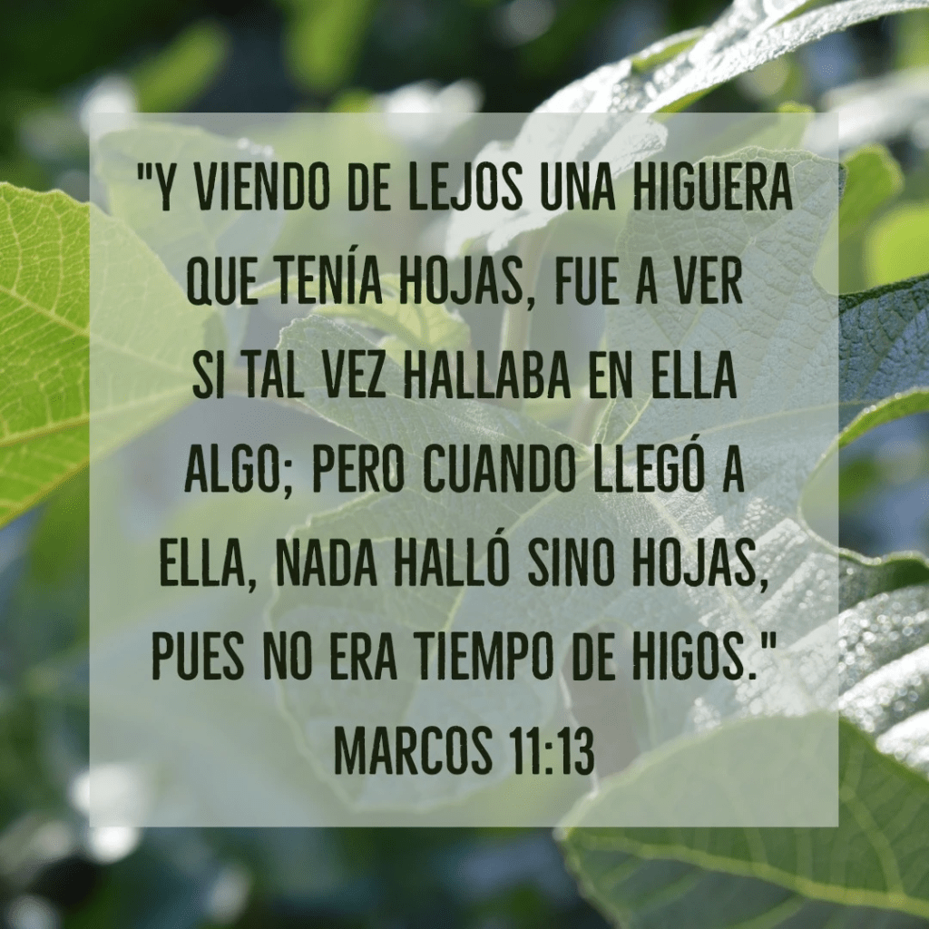 Al día siguiente, cuando salieron de Betania, tuvo hambre. Y viendo de lejos una higuera que tenía hojas, fue a ver si tal vez hallaba en ella algo; pero cuando llegó a ella, nada halló sino hojas....Entonces Jesús dijo a la higuera: Nunca jamás coma nadie fruto de ti. Y lo oyeron sus discípulos. Marcos 11:12-14