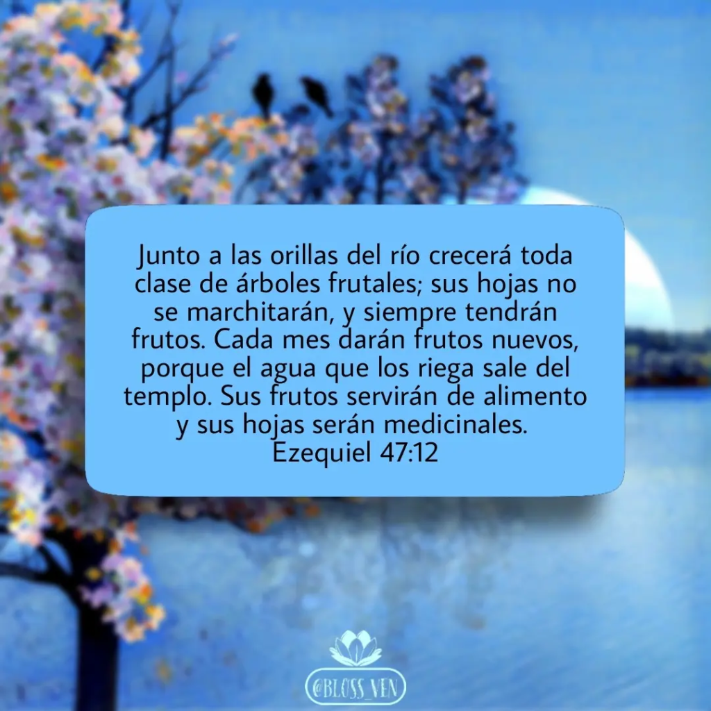 "Junto al río, en su orilla, a uno y otro lado, crecerán toda clase de árboles que den fruto para comer. Sus hojas no se marchitarán, ni faltará su fruto. Cada mes darán fruto porque sus aguas fluyen del santuario; su fruto será para comer y sus hojas para medicina." Ezequiel 47:12