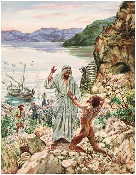 El Hijo de Dios, Jesucristo, había ido hasta la costa de los gadarenos a realizar actos de liberación y salvación. En cuanto llegó comenzó su obra de gracia sanando las más terrible de las enfermedades espirituales: La posesión demoníaca. Así lo narra Marcos: "Se le acercó un hombre que tenía un espíritu impuro. Este hombre vivía entre los sepulcros, y nadie lo podía sujetar, ni siquiera con cadenas. Muchas veces había sido sujetado con grilletes y cadenas, pero él rompía las cadenas y despedazaba los grilletes, de manera que nadie podía dominarlo.... Jesús le dijo: «Espíritu inmundo, sal de este hombre».... Había allí una gran manada de cerdos paciendo junto al monte, y todos los demonios le rogaron: «¡Envíanos a los cerdos! ¡Déjanos entrar en ellos!» Jesús se lo permitió. Y saliendo los espíritus inmundos, entraron en los cerdos; y la manada, unos 2,000, se precipitó por un despeñadero al mar, y en el mar se ahogaron. Los que cuidaban los cerdos salieron huyendo y dieron la noticia en el pueblo y por los campos, y la gente fue a ver lo que había pasado. Llegaron adonde estaba Jesús y, cuando vieron al que había estado poseído por la legión de demonios, sentado, vestido y en su sano juicio, tuvieron miedo. Los que habían presenciado estos hechos le contaron a la gente lo que había sucedido con el endemoniado y con los cerdos. Y comenzaron a rogar a Jesús que se fuera de su región. Marcos 5:3-17