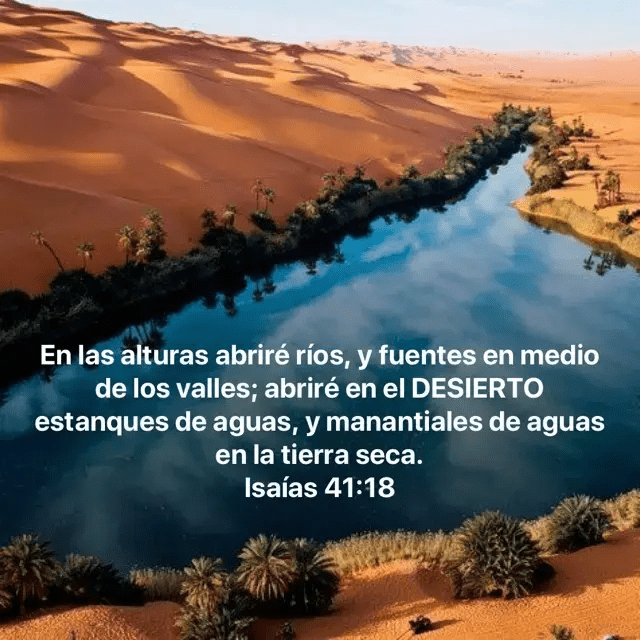 La palabra "Desierto" en la Biblia simboliza desolación, esterilidad, peligro, despojo, aflicción, mientras que la palabra "Manantial" significa fe, amor, esperanza, abundancia de gracia para perdón, vida y salvación. Estamos viviendo en un mundo destruido por la guerra, la violencia, cambios climáticos extremos, pandemias, y la multiplicación de la maldad que es como un desierto de inmoralidad. Pero justo en medio de este desierto podemos encontrar en Dios manantiales de amor, paz y abundancia de vida. Agar, cuando fue expulsada de la casa de Abraham y viajó por el desierto, se le acabó el agua. Tanto ella como su hijo estaban hambrientos y listos para morir de sed. Mientras ella clamaba, Dios le abrió los ojos y vio un pozo de agua". Gén.21:14-19 ¡Encontró un manantial en el desierto! Cuán cierto es esto de nuestras propias vidas. Pasamos hambre y sed justo en medio de la abundancia. Estos son algunos de los manantiales en el desierto que podemos encontrar en el SEÑOR nuestro Dios: