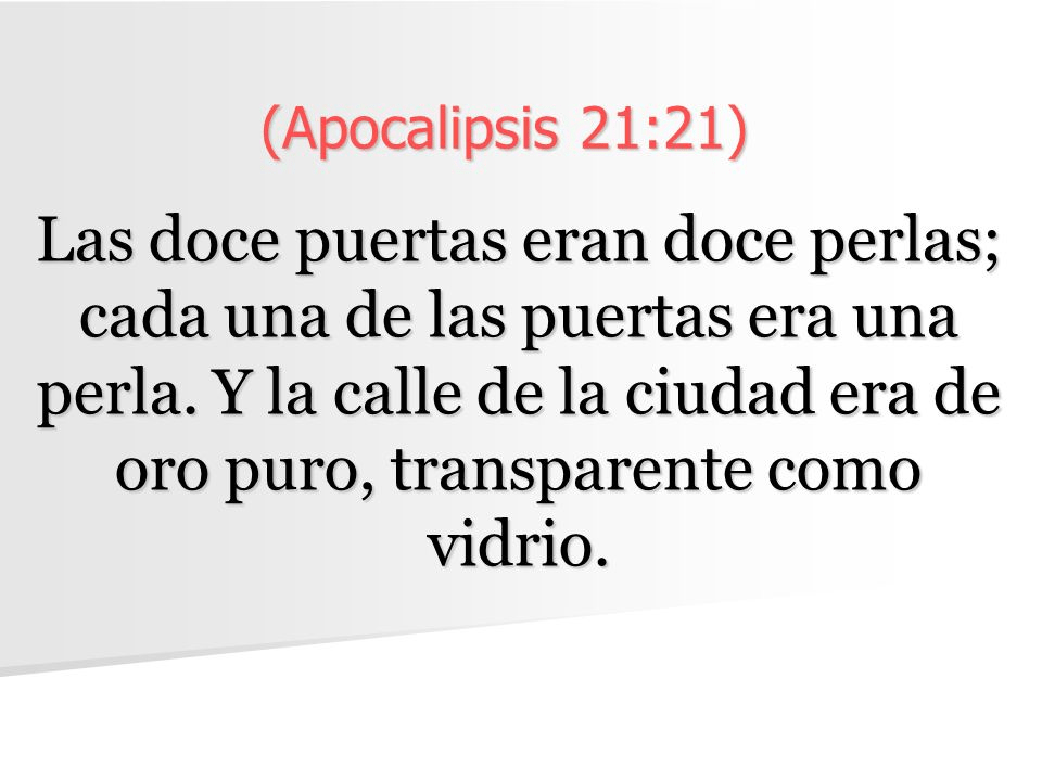 "Cada una de las puertas era una perla" Cada entrada a la vida celestial es una perla. ¿Qué es una Perla? Es una ostra que se hace una herida con un grano de arena, y el grano queda metido en la llaga. Se ponen en función todos los recursos para sanar la herida. Cuando ésta queda sana y el proceso de reparación termina, es una perla lo que cierra la herida. El SEÑOR Jesús también es "La Perla de gran precio," Mateo 13:45-46 Perla que adquiere quien lo ha dado todo y ha aceptado renunciar a todo, por lo cual dice Pablo en Filipenses 3:8: "Lo perdí Todo con tal de ganar a Cristo", la única perla de gran valor. Toda perla se obtiene con dolor. ¡La perla es una herida cicatrizada! ¡Si no hay heridas no hay perla! Y el SEÑOR Jesús fue rechazado, abandonado, menospreciado, traicionado y herido por nuestros pecados, pero el fruto glorioso de toda su aflicción y dolor en la Cruz fue “nuestra salvación”.