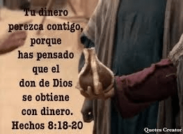 Pedro le dijo: "Tu dinero perezca contigo, porque has pensado que el don de Dios se obtiene con dinero". Hechos 8:20