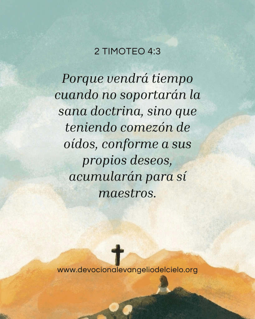 Este versículo bíblico, tan actual como urgente, describe el abandono progresivo de la sana doctrina y la proliferación de enseñanzas adulteradas que complacen más al ego humano que al corazón de Dios. Muchos hoy se resisten a la predicación bíblica auténtica, la que llama al arrepentimiento, a la santidad y a una vida crucificada con Cristo. Desean escuchar un evangelio fácil, de palabras suaves y una vida sin cruz. «El que no toma su cruz y me sigue, no puede ser mi discípulo». Luc. 14:27. Anhelan mensajes motivacionales que les den paz superficial sin confrontar su pecado. Prefieren oír lo que les agrada, en lugar de lo que los transforma.