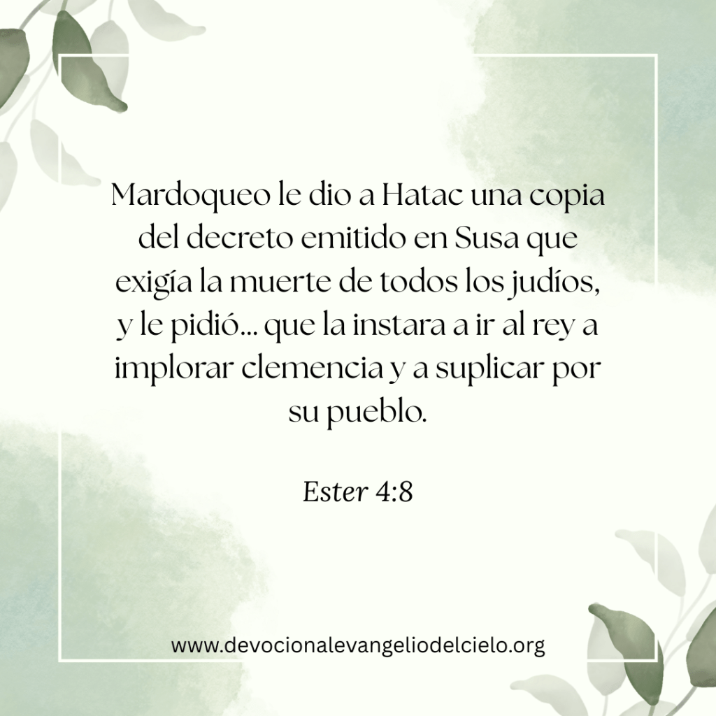 «Mardoqueo le dio a Hatac una copia del decreto emitido en Susa que exigía la muerte de todos los judíos, y le pidió… que la instara a ir al rey a implorar clemencia y a suplicar por su pueblo.» — Ester 4:8