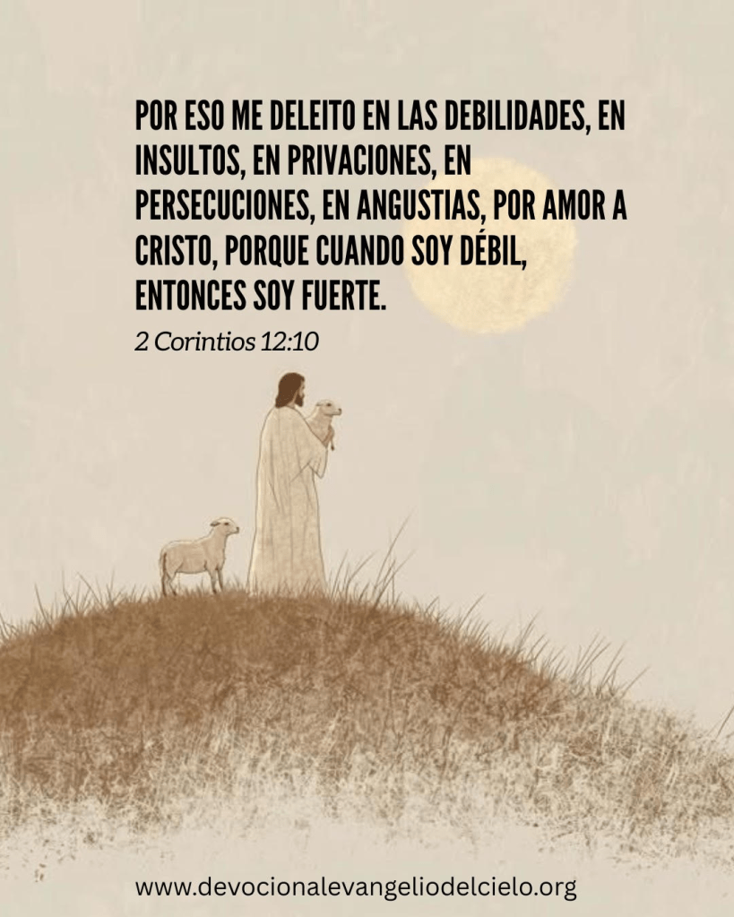 🙏 Oración: SEÑOR, gracias porque en mi debilidad me haces fuerte. Enséñame a no confiar en mí mismo, sino a depender de tu poder en todo momento. Que mi fragilidad sea el lugar donde tu fuerza se perfeccione y tu gloria se manifieste. Amén.