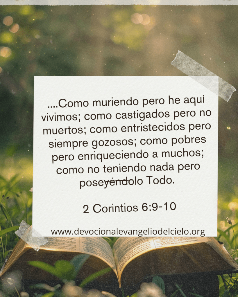 ….Como muriendo pero he aquí vivimos; como castigados pero no muertos; como entristecidos pero siempre gozosos; como pobres pero enriqueciendo a muchos; como no teniendo nada pero poseyéndolo Todo. 2 Corintios 6:9-10