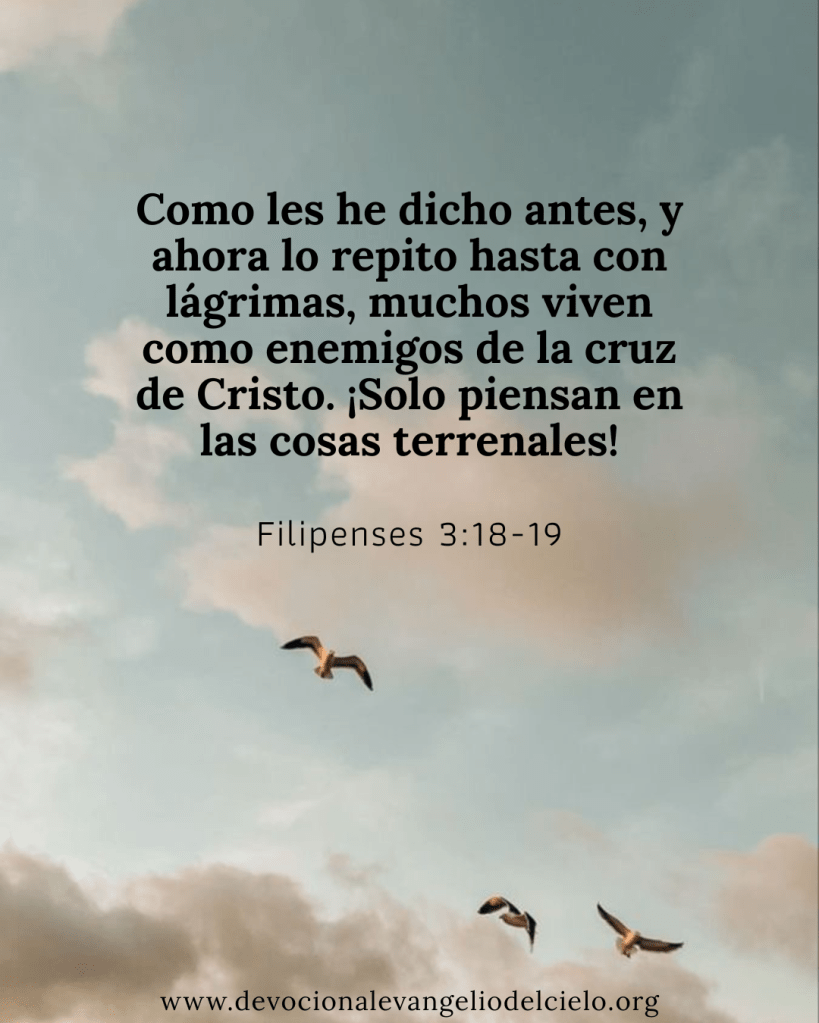 Como les he dicho antes, y ahora lo repito hasta con lágrimas, muchos viven como enemigos de la cruz de Cristo.¡Solo piensan en las cosas terrenales! Filipenses 3:18-19